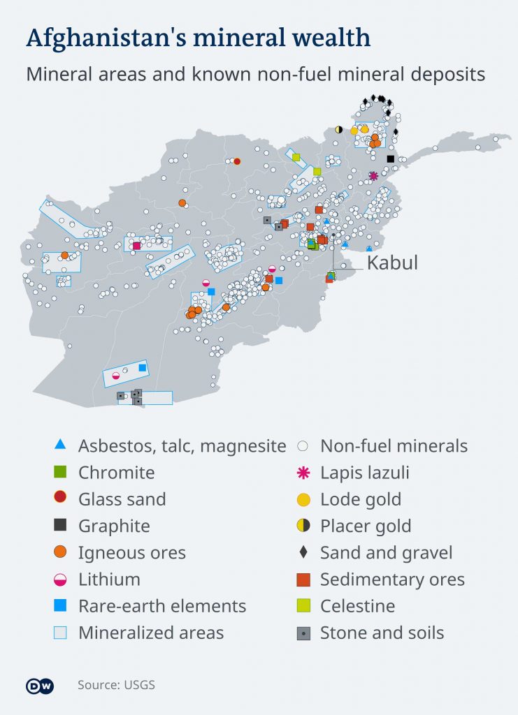 سن 2010 میں امریکی فوجی ماہرین اور ماہرین ارضیات کی ایک رپورٹ میں اندازہ لگایا تھا کہ افغانستان، جو بظاہر دنیا کے غریب ترین ممالک میں سے ایک ہے، اس ملک میں تقریباً ایک ٹریلین امریکی ڈالر کی مالیت کے معدنی وسائل موجود ہیں، جس میں لوہے، تانبے، لیتھیم، کوبالٹ اور دیگر نایاب معدنی ذخائر شامل ہیں۔ تاہم گزشتہ ایک دہائی کے عرصے میں مسلسل پرتشدد کارروائیوں کی وجہ سے یہ وسائل اچھوت رہے ہیں۔