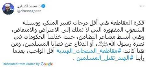 محمد الصغیر نے لکھا کہ ’بائیکاٹ کرنے کا آئیڈیا برائی کو روکنے کا سب سے نچلا درجہ ہے اور یہ ایسے افراد کے لیے اپنی آواز اٹھانے کا طریقہ ہے جن کے ہاتھ میں کچھ نہیں ہوتا اور یہ یکجہتی کے اظہار کا بہترین ذریعہ ہے۔‘ احمد قسیم نامی ایک صارف نے لکھا کہ عرب حکمران بہت کمزور ہیں، وہ انڈیا کے خلاف کوئی کارروائی نہیں کر سکتے، لیکن معاشی بائیکاٹ سے انڈیا کو تکلیف ہو گی اور ان کو بھی جو مسلمانوں کا قتل کرتے ہیں۔‘