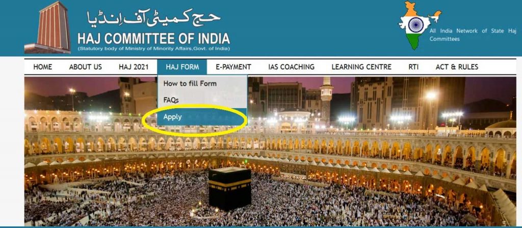 مرحلہ 1: hajcommittee.gov.in کی آفیشل ویب سائٹ پر جائیں اور "HAJ فارم” پر کلک کریں اور "Apply” کو منتخب کریں۔