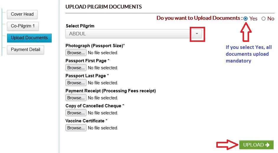 تمام حاجیوں کی تصاویر اور دستاویزات اپ لوڈ کرنے کے بعد ’اپ لوڈ’ بٹن پر کلک کریں۔ مندرجہ بالا اقدامات ہر شریک حاجی کے لیے دہرائے جائیں۔