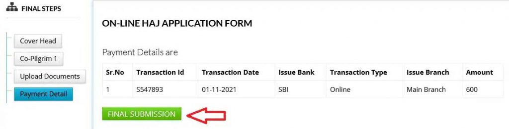 لین دین کی کامیابی سے تکمیل پر ایک لین دین کی رسید تیار کی جائے گی۔ کامیاب ادائیگی کے بعد براہ کرم فائنل جمع کرانے کے لیے آن لائن HAF میں دوبارہ لاگ ان کریں۔ "FINAL SUBMISSION” پر کلک کریں، آپ کو الرٹ میسج ملے گا۔ Ok پر کلک کریں۔
