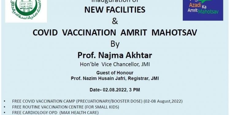پروفیسر نجمہ اختر شیخ الجامعہ،جامعہ ملیہ اسلامیہ مؤرخہ دو اگست دوہزار بائیس کو ٹیکہ کیمپ کے ساتھ ساتھ انصاری ہیلتھ سینٹر میں نئی جڑی ہوئی دگیر سہولیات کا بھی افتتاح کریں گی۔ یونیورسل امیونائی زیشن پروگرام(یو آئی پی) حکومت ہند کے مطابق یونیورسٹی نے جی این سی ٹی،دہلی کے ساتھ مل کر ’روٹین ٹیکہ سینٹر شروع کیاہے جس میں چھوٹے بچوں کو ہر جمعرات کو ٹیکہ لگایا جائے گا۔