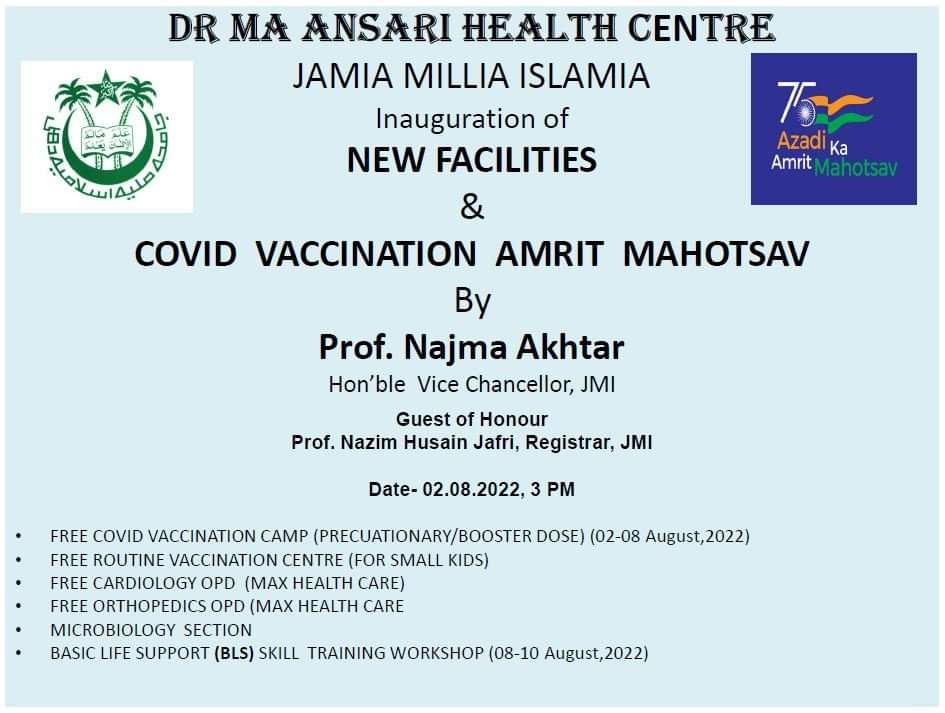 ڈاکٹر ایم۔اے انصاری ہیلتھ سینٹر،جامعہ ملیہ اسلامیہ آزادی کا امرت مہتسو‘ کے حصے کے طور پر مشن موڈ کے تحت کوڈ ٹیکہ کیمپ جس کا عنوان ’کوڈ ٹیکہ امرت مہتسو‘ ہے مؤرخہ دو اگست سے چھے اگست دوہزار بائیس تک اٹھارہ سال اور اس سے زیادہ عمر کے لوگوں کے لیے کئی متعدد پروگرام منعقد کررہاہے۔