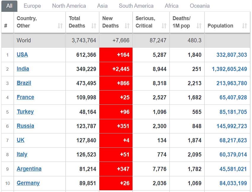 بہرحال کورونا سے ہونے والی اموات کے اعدادوشمار پر نظر ڈالیں تو بھارت میں یہ ڈیٹا ساڑھے تین لاکھ (پیر صبح آٹھ بجے تک worldometers.infoکے مطابق) کے آس پاس تھا۔ کورونا سےدنیا میں سب سے زیادہ اموات امریکہ میں ہوئی ہیں ، جبکہ بھارت اس معاملے میں دوسرے نمبر پر ہے۔ برازیل تیسرے ، فرانس چوتھے اور ترکی پانچویں نمبر پر ہے۔
