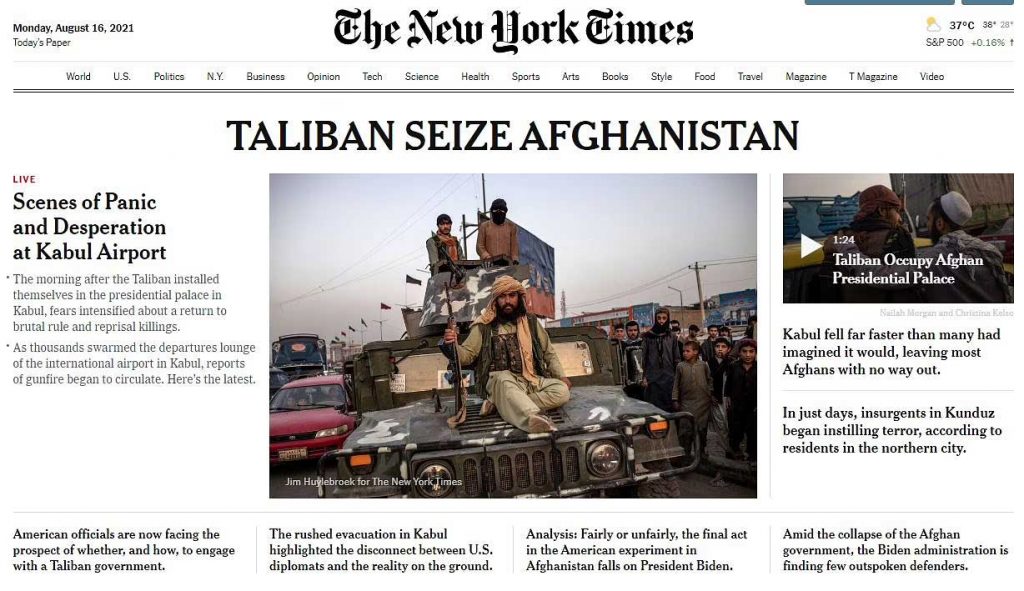 نیویارک ٹائمز نے اپنی ہیڈ لائن لگائی ہے : ’’Taliban Seize Afghanistan‘‘ یعنی طالبان نے افغانستان پر قبضہ کیا۔
