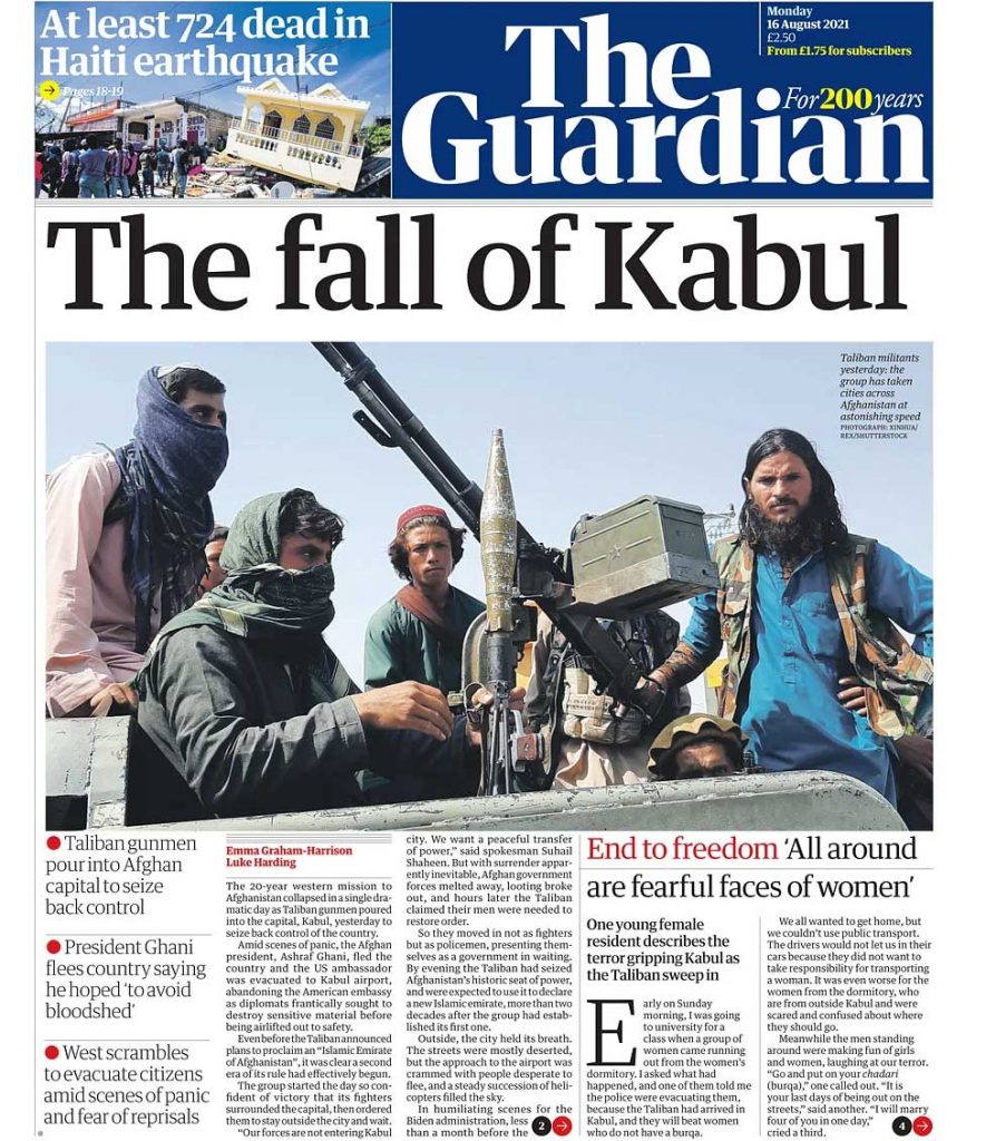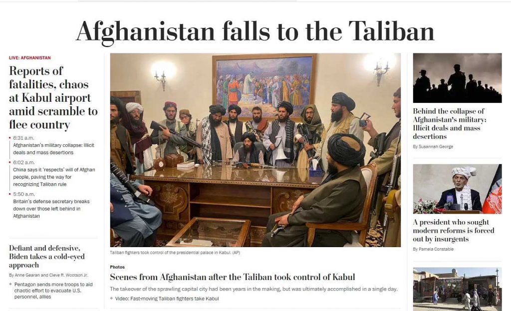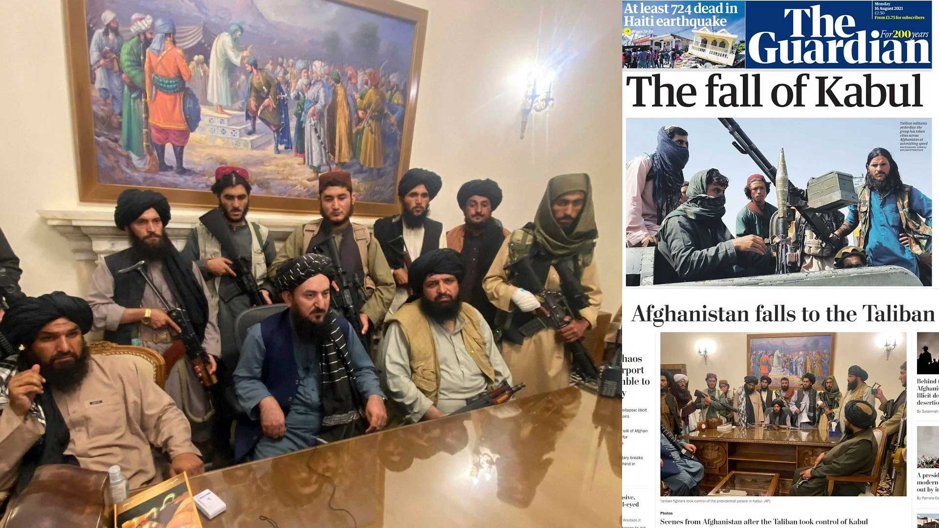بندوق لہراتےطالبانی ، لانچر ،نقل مکانی کی کوشش کرتے لوگ ، امریکی سفارت خانہ میں ہیلی کاپٹر ، افغانستان کے صدر ہاؤس میں ہتھیار کے ساتھ کرسی پر بیٹھے طالبان کے کمانڈر ،ایسی ہی تصاویر کے ساتھ انٹرنیشنل میڈیاکہ فرنٹ پیج بھرے پڑے ہیں ۔