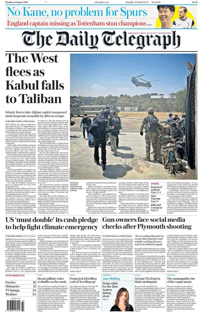 ڈیلی ٹیلی گراف نے لکھا کہ برٹش اور امریکی افغانستان چھوڑ کر نکل رہے ہیں اس سے پہلے کہ کابل ایئر پورٹ پر طالبان کا قبضہ ہوجائے ۔ قریب دو ہفتے پہلے طالبان نے افغانستان کے ایک شہر کو قبضے میں لیا تھا اور اب کابل پر بھی قبضہ ہو چکا ہے ۔