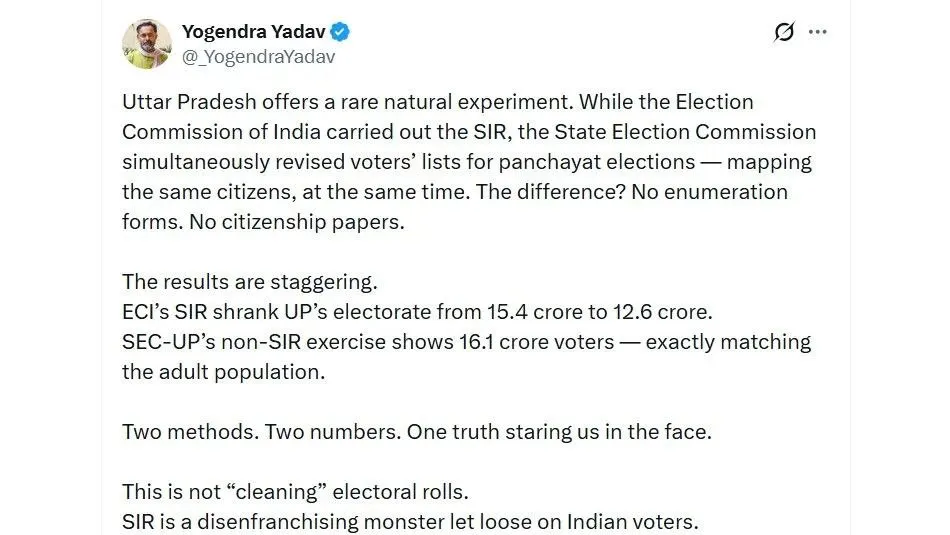 پنچایتی انتخابات کے لیے ای سی آئی کی ایس آئی آر اور ریاستی الیکشن کمیشن کی فہرستیں تقریباً ایک ہی وقت میں ووٹروں کی گنتی کرتی ہیں، لیکن تعداد میں بہت زیادہ فرق نے سوالات کو جنم دیا ہے۔ انتخابی تجزیہ کار اور سوراج انڈیا کے سربراہ یوگیندر یادو نے بھی سوالات اٹھائے ہیں۔ انہوں نے اس تضاد کو "قدرتی تجربہ” قرار دیا۔ سوشل میڈیا اور انڈین ایکسپریس میں ایک مضمون میں، انہوں نے کہا کہ یہ تضاد SIR کے عمل میں خامیوں کو واضح طور پر بے نقاب کرتا ہے۔