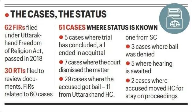 رپورٹ کے مطابق پچھلے مہینے تک، اتراکھنڈ پولیس کے ذریعہ UFRA کے تحت 62 مقدمات درج کیے گئے تھے، جو 2018 میں بی جے پی حکومت نے پاس کیے اور اس کے تحت مزید مضبوط ہوئے۔ دی انڈین ایکسپریس کے ذریعہ ریاست کے 13 اضلاع سے حاصل کردہ 51 مقدمات کے عدالتی ریکارڈ سے پتہ چلتا ہے کہ ستمبر 2025 تک، صرف پانچ مقدمات کی مکمل سماعت ہوئی ہے۔ ان میں سے سب بری ہو چکے ہیں۔ کم از کم سات کو درمیان میں برخاست کر دیا گیا ہے بڑی حد تک شکایت کنندگان کے مخالف ہونے، تصدیق کی کمی، اور استغاثہ کی طرف سے زبردستی یا لالچ کو ثابت کرنے میں ناکام رہے ۔