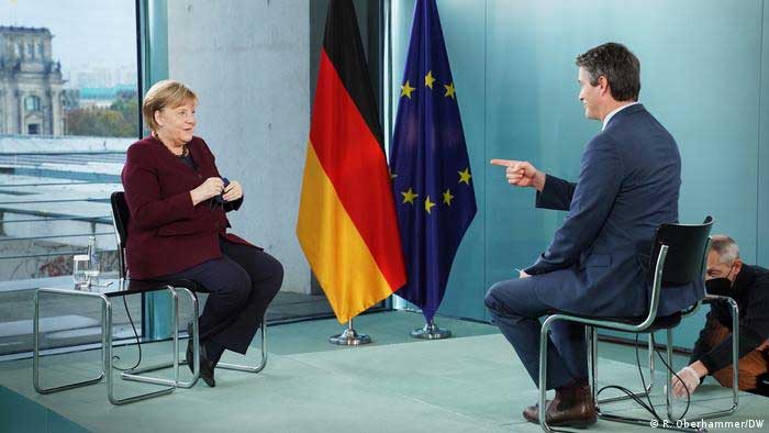 حسب معمول چہرے پر اطمینان اور مسکراہٹ لیے انگیلا میرکل نے برلن میں اپنے چانسلر دفتر میں بیٹھ کر ڈوئچے ویلے کے نیوز ڈپارٹمنٹ کے سربراہ ماکس ہوفمان کو انٹرویو دیا۔ چانسلر شپ کے 16 سالہ دور کے اختتام پر انگیلا میرکل نے اپنے دو بڑے چیلنجز، اپنی مایوسیوں اور اپنے ممکنہ جانشین اولاف شوُلز کے بارے میں اپنے خیالات و جذبات کا اظہار کیا۔ اس موقع پر میرکل سے گزشتہ ماہ یعنی اکتوبر میں یورپی یونین کی انٹر نیشنل کانفرنس میں بطور یورپی لیڈر اپنی آخری شرکت کے موقع پر انہیں ’’ سمجھوتے کی ایک مشین‘‘ کہے جانے کے بارے میں ان کا خیال پوچھے جانے پر میرکل کا جواب تھا،‘‘ میں یقیناً کوئی مشین نہیں….. ایک انسان ہوں۔ میں اس طرح کی بات چیت یا مباحثے میں ہمیشہ کشادہ ذہنی کیساتھ حصہ لیتی ہوں۔‘‘ میرکل کا اشارہ بین الاقوامی اجلاسوں میں ان کی پالیسی سازی کے نقطہ نظر کی طرف تھا۔ میرکل نے اس بارے میں بھی گفتگو کی کہ جب وہ کسی ایسے لیڈر سے بات چیت کر رہی ہوتی ہیں جو اپنی اقدار کے بارے میں کسی سے اپنے خیالات کو شیئر نہیں کرتا اور اپنی حد تک محدود رکھنا چاہتا ہے تو ان کا طریقہ کار یا حکمت عملی کیا ہوتی ہے؟ میرکل کا کہنا تھا،’’ہمیں اس دنیا کے بارے میں بنیادی طور پر مختلف تصور رکھنے والوں کی بات بھی سننی چاہیے۔ اگر ہم ایک دوسرے کے خیالات نہیں جانیں گے اور ایک دوسرے کی بات سنیں گے ہی نہیں تو ہم کبھی بھی کسی بھی مسئلے کے حل تک نہیں پہنچیں گے۔‘‘