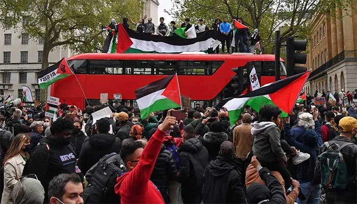 فلسطین پراسرائیلی جارحیت کے خلاف ہزاروں افراد نے لندن میں احتجاجی مظاہرہ کیا، وسطی لندن کی فضا ’آزاد فلسطین‘ اور ’اللّٰہ اکبر‘ کے نعروں سے گونج اٹھی۔