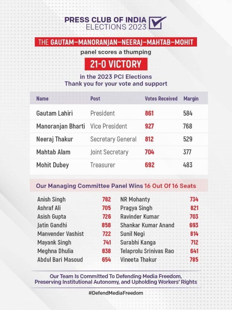 ہندستان میں جرنلسٹوں کی سب سے بڑی تنظیم پریس کلب آف انڈیا کے تنظیمی الیکشن کا رزلٹ آگیا ،جس کے مطابق معروف جرنلسٹ گوتم لہری کی قیادت والے پینل نے شاندار جیت حاصل کی اور اس نے منیجنگ کمیٹی سمیت تمام عہدوں پر اپنا پرچم لہرادیا جبکہ اردو کوٹے کے تینوں امیدواروں نے ریکارڈ ووٹ حاصل کئے -اس الیکشن پر پورے بھارت کی نظر تھی کیونک موجودہ وقت میں کم و بیش ہر اہم انسٹی ٹیوٹ پر دائیں بازو نے قبضہ کرلیا ہے مگر پریس کلب آف انڈیا نے اس آزمائشی دور میں مزاحمت پسندانہ رول ادا کیا ہے اور جرنلسٹوں کے حق میں آواز اٹھا ئی ہے ۔